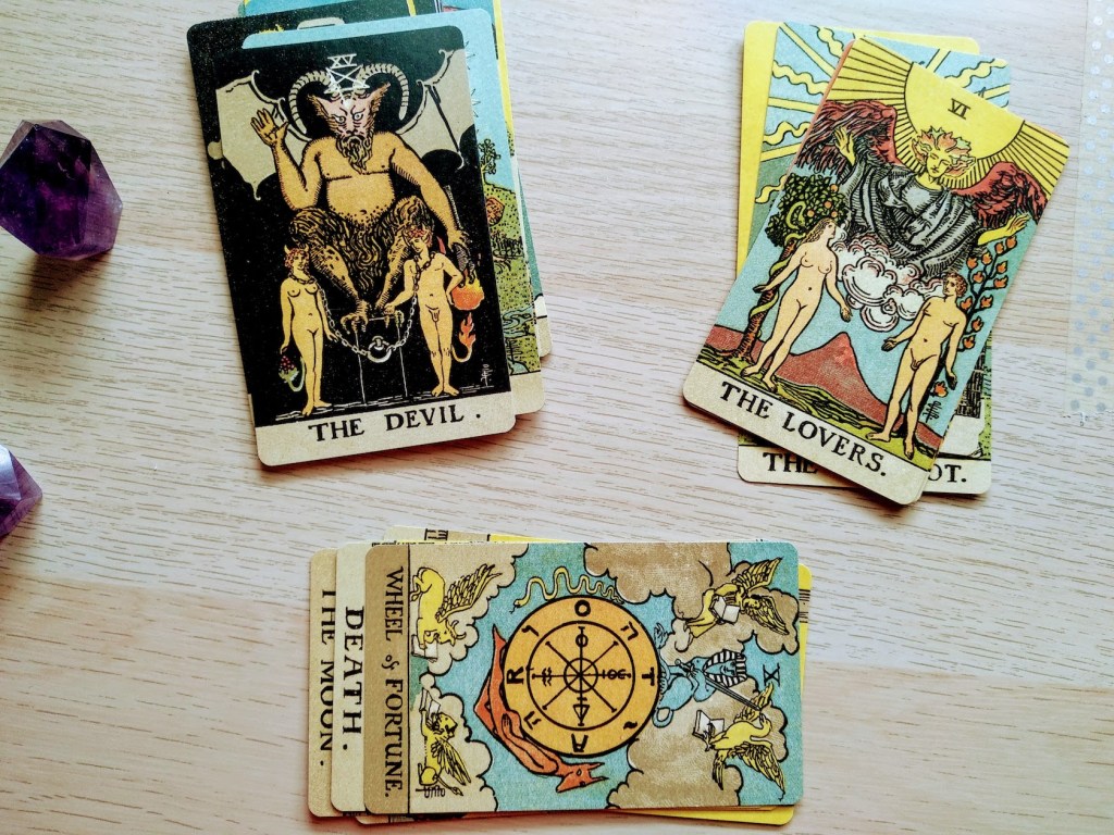 Divide tu baraja en arcanos mayores y menores, y coloca los arcanos mayores de tal forma que los puedas ver todos. No hace falta que estén por orden. ¿Qué ves? ¿Qué cartas te llaman más la atención? Apunta las cartas llamativas en tu cuaderno, tus favoritas y tus menos favoritas, con la emoción que te provocan. ¿Hay alguna carta que te da calma? ¿Otra te alegra? ¿Alguna te da ansiedad, o tristeza, o sensación de libertad? Apúntalo todo, sin mirar lo que significan aún. Pon tus propias palabras clave para cada una.